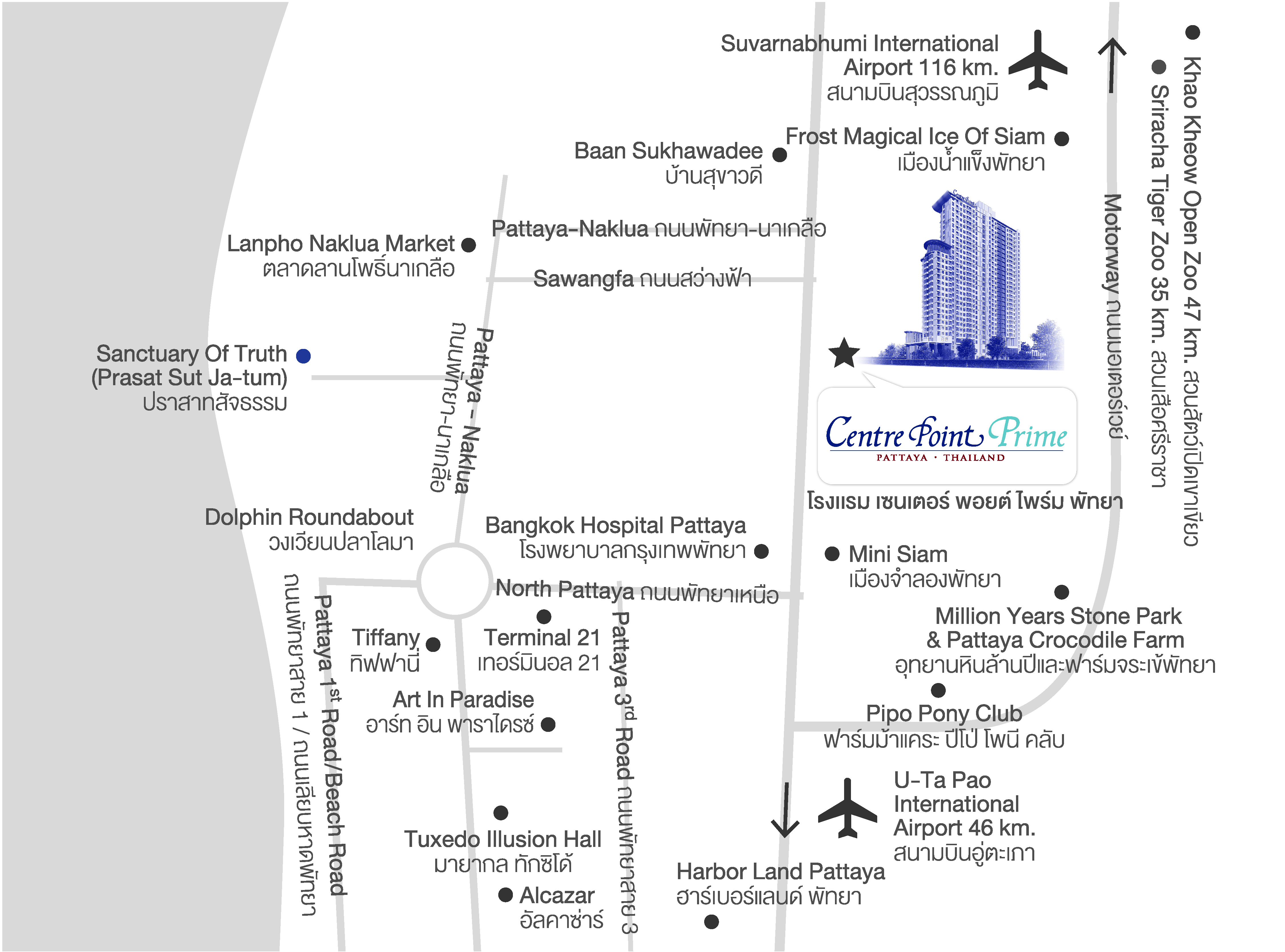 센터포인트 프라임호텔 파타야는 파타야 외곽이라는 위치의 단점이 있지만 무료셔틀을 파타야 북부 그랑데 센터포인트 호텔이 위치한 터미널 21까지 6회, 그리고 파타야 해변까지 하루에 3회 운영하고 있어 무료셔틀을 잘 활용하면 파타를 즐기는데 전혀 문제가 없습니다. 호텔에서 700미터 지점에 드리머마켓이라는 야시장, 1킬로미터 지점에 24시간 운영 맥도널드 햄버거, 그리고 입구 길 건너에 로터스 수퍼가 있어 나름 편리합니다.